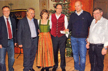 Bürgermeister Josef Bauer, Helmut Brossman, Daniela März, Bernhard Ulrich und Walter Neugebauer (v.l.n.r.) übergaben am Ende des Abends die Spende an KUNO-Oberarzt Dr. Dirk Grothues (2.v.r.).