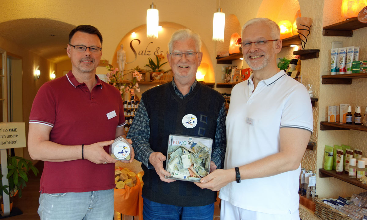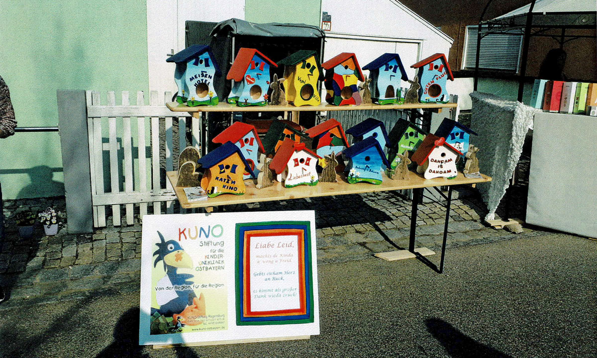 Stefan Körper hat die kalten und trüben Wintermonate genutzt und bunte Vogelhäuschen gezimmert, die er am 24. März auf dem Fastenmarkt in Pfatter verkauft hat. Den Erlös seiner Aktion in Höhe von 562 Euro hat Herr Körper an KUNO gespendet.
