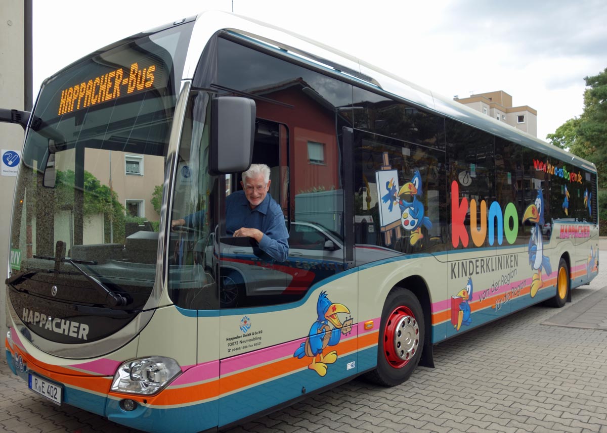 Der Busunternehmer Christian Happacher stellt die Werbeflächen seiner Busse gemeinnützigen Organisationen zur Verfügung. Deshalb konnte sich KUNO schon vor 14 Jahren über "seinen" ersten Bus freuen - der jetzt einen Nachfolger bekam.