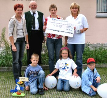 Hinterzhofer Kirta, Flohmarkt und Grillfeier Einen Scheck über 750 Euro konnten Vertreter des 'Klopfercubs' Hinterzhof an KUNO-Beauftragte Birgit Schönke von der Pressestelle der Uni-Klinik übergeben. Schönke zeigte sich hocherfreut und