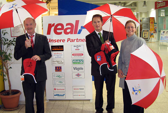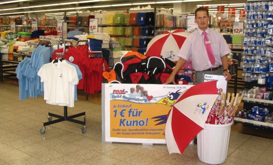 Schirme und Rucksäcke für KUNO Schirme, Rucksäcke, T-Shirts und Kinder-Caps ließen die real-Märkte Pentling und Regensburg im Rahmen ihrer Aktion für KUNO vom Sommer 2007 mit dem KUNO-Logo bedrucken. Aus