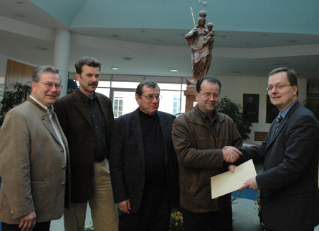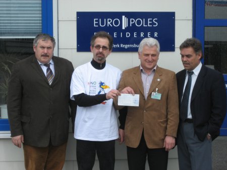 Führungskräfte der Pfleiderer Europoles spendet an die KinderUNiklinik Ostbayern ihre Sonderzahlung. Die Scheckübergabe fand am 28.02.2007 statt, bei der der KUNO-Vertreter Johann Hecht den Scheck über 3.500 Euro entgegen nahm.