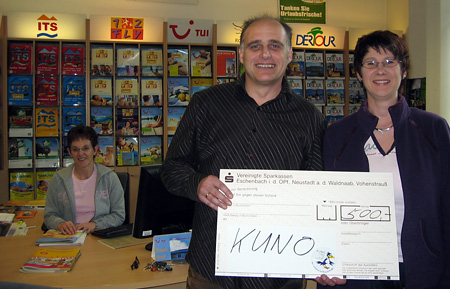 Tombola in Vohenstrauss Teil eines Aktionstages von Radio Ramasuri und der Firma 'Reiseland' war auch eine Tombola für KUNO. Dabei kamen 405 Euro zusammen. Mitarbeiterin Sonja Lütger steuerte 20 Euro