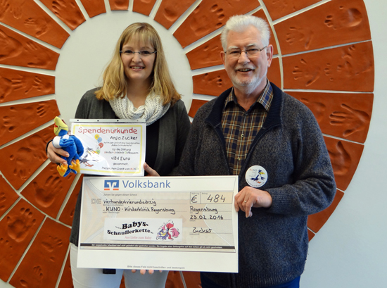 484 Euro aus der Sammelaktion von Babys-Schnullerkette 23.02.2016 Anja Zucker bietet mit ihrem Unternehmen Babys-Schnullerkette einen Shop für Babyartikel und einzigartige Windelkreationen. Immer wieder sammelt sie dabei Spenden für einen