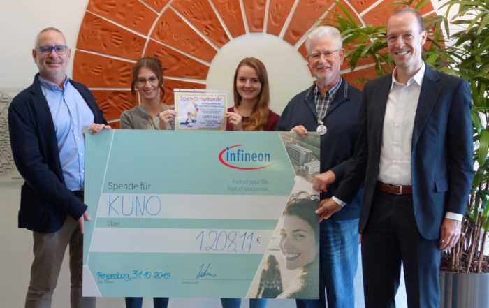 Die Auszubildenden von Infineon Regensburg haben eine Spende an KUNO übergeben. Die Azubis verkauften ein selbst gestaltetes Kochbuch und konnten mit ihrem kulinarischen Werk eine schöne Summe einnehmen, die vom Betriebsrat sogar noch aufgestockt wurde.