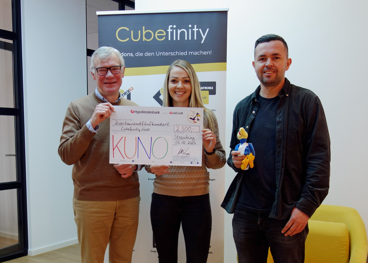 In der Vorweihnachtszeit trifft man nicht nur neue Gesichter – oft sind auch alte Bekannte dabei, bei denen man sich immer besonders freut, wenn man sich wiedersieht. So geht es auch mit der Cubefinity GmbH, die KUNO seit bereits vier Jahren jeden Advent treu unterstützt. Der IT-Berater hatte auch diesmal wieder ins Büro nach Straubing eingeladen, wo KUNO-Vorstand Prof. Segerer herzlich von Geschäftsführer Muhamet Gashi und Marketing Managerin Valentina Utz begrüßt wurde. Die Spende in Höhe von 2.500 Euro ist ein gern gesehener Beitrag zum kind- und familiengerechten Betreib der KUNO-Kliniken, deshalb ein herzliches Dankeschön von KUNO!