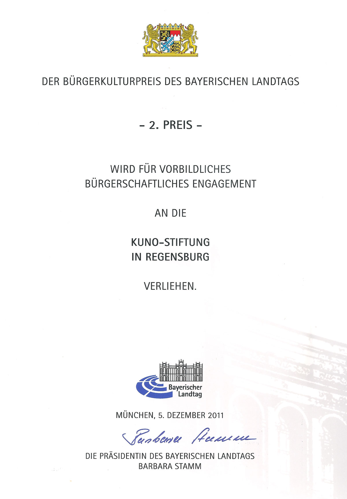 Ausgezeichnete Leistung: die KUNO-Stiftung gewann im Dezember 2011 zusammen mit Anderen den Bürgerkulturpreis des Bayerischen Landtages zum Thema „Selbst ist die Region – Bürger bauen Zukunft“.
