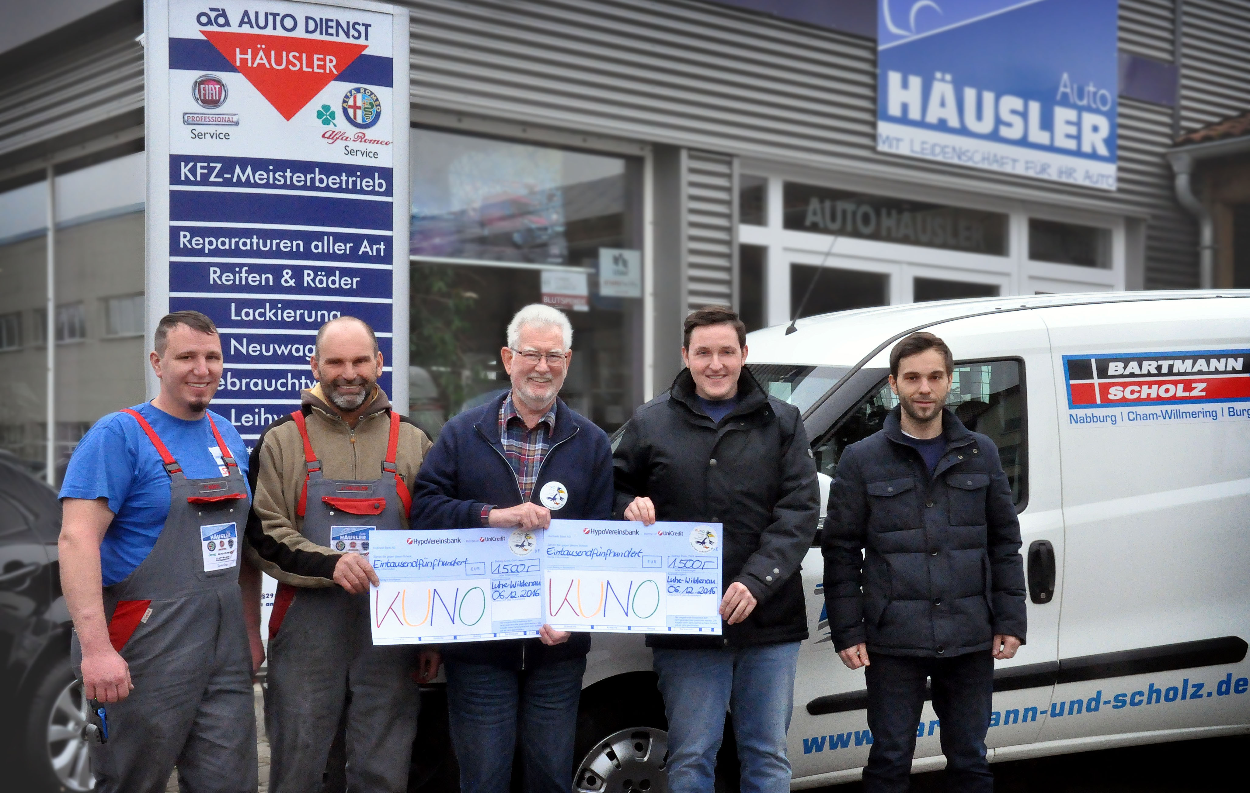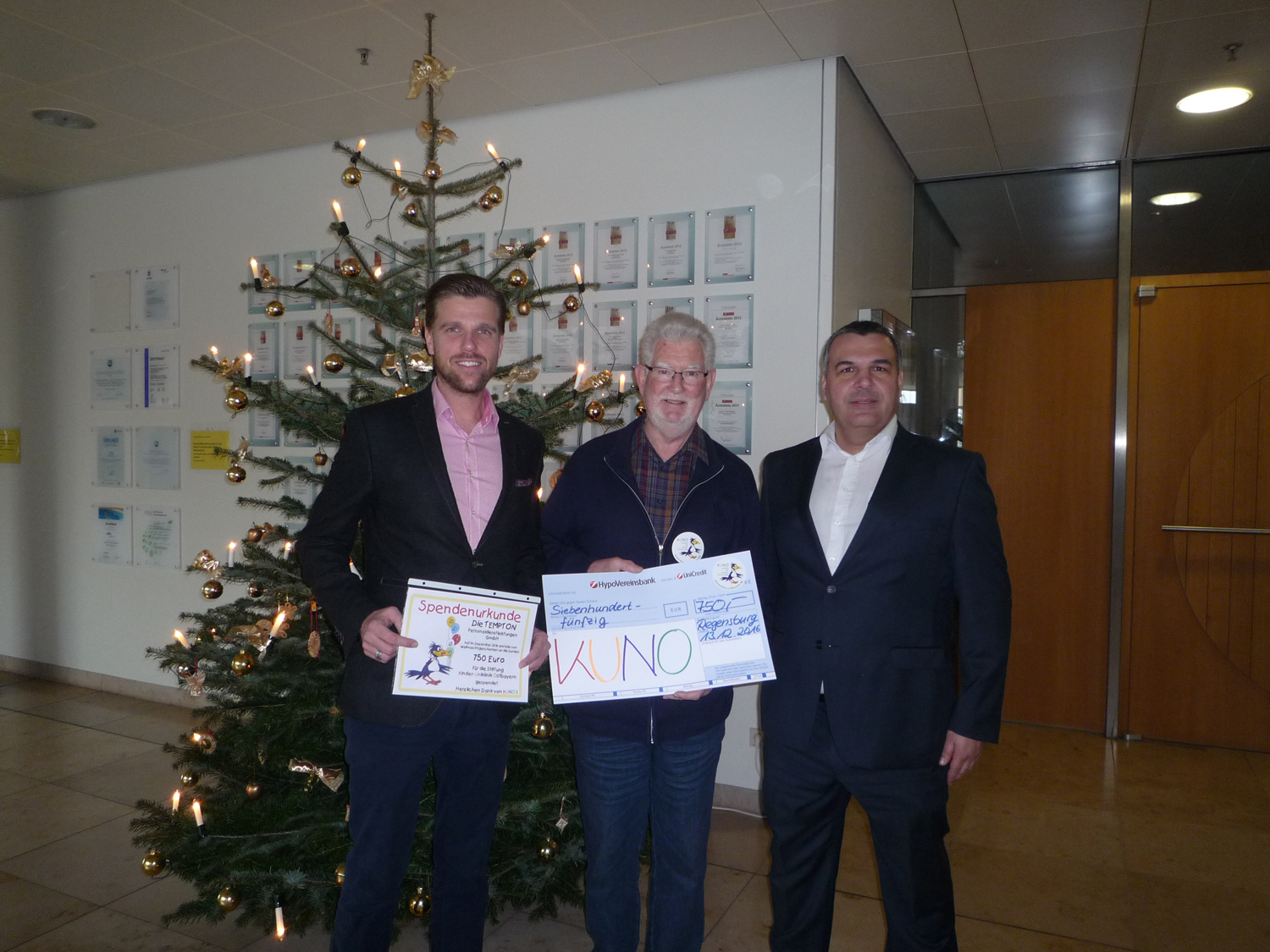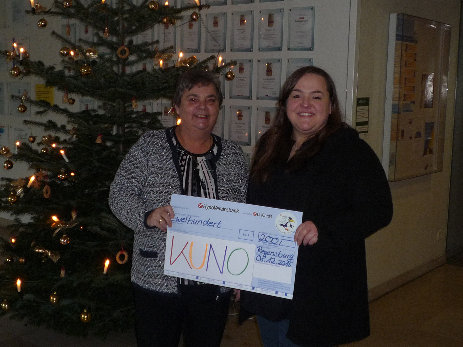 Die Autorin Rita Falk signierte 2,5 Stunden ihr neuestes Werk im Donau-Einkaufzentrum in Regensburg für den guten Zweck. Am Ende konnten die Vertreter von Händlmaier, Pustet Regensburg und dem dtv-Verlag 2.400 Euro an KUNO übergeben.