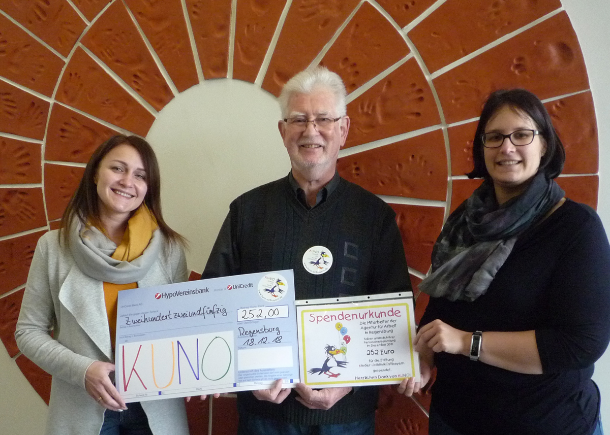Im Rahmen der Personalversammlung der Agentur für Arbeit in Regensburg, bei der nicht nur mit heißen Würstchen und Getränken für das leibliche Wohl gesorgt wurde, sondern auch Reanimations-Kurse und Feuerlöscher-Demonstrationen geboten wurden, haben die Mitarbeiter insgesamt 252 Euro für KUNO gespendet. Die Personalratsvorsitzende Susanne Gebhardt und ihre Kollegin Helena Wittich haben es sich nicht nehmen lassen, den Betrag persönlich an KUNO-Vorstand Dr. Hans Brockard zu übergeben.
