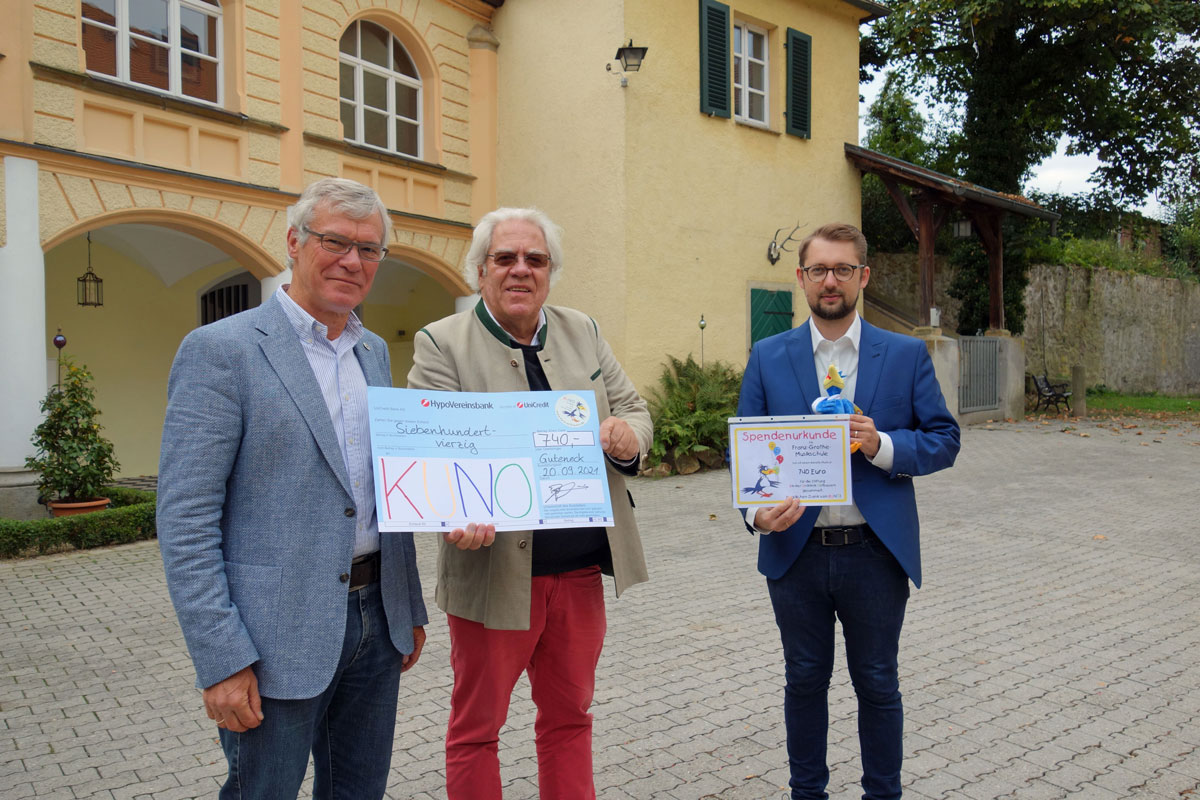 Ein schöner Nebeneffekt dieser Kooperation war die Chance, keinen Eintritt für die Aufführung zu verlangen, sondern die Gäste stattdessen um eine Spende zu bitten. So war der Abend am Ende nicht nur für die Schüler ein voller Erfolg, sondern auch für die KUNO-Stiftung, die sich über eine Gesamt-Spendensumme von 740 Euro freuen konnte – vor Ort überreicht durch Thorsten Willecke, den Leiter der Franz-Grothe-Schule, und dem Schlossherrn, Burkhard Graf Beissel von Gymnich.