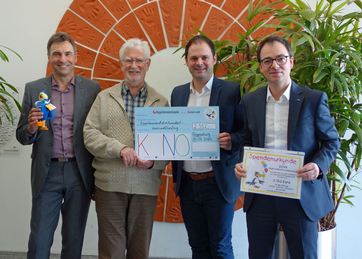 Die Regionaldirektion Regensburg der DEVK Versicherungen organisiert für ihre Mitarbeiter in Ostbayern jedes Jahr eine Jahresauftakt-Tagung. Im Rahmen dieser Tagung soll aber auch der Spaß nicht zu kurz kommen, und deshalb gab es dieses Jahr eine Tombola inklusive einer Versteigerung des ein oder anderen Sportler-Trikots. Da sich das Einzugsgebiet der DEVK Regionaldirektion Regensburg mit dem Einzugsgebiet der beiden KUNO-Kliniken deckt, lag die Idee nahe, den Erlös aus der Tombola zu spenden – die rund 150 Mitarbeiter kauften insgesamt 1.500 Lose zu je einem Euro und spendeten auch zusätzlich noch fleißig für KUNO. So konnten am Ende Rainer Spieß, Sven Delatron und Peter Mlinaric die stolze Summe von 2.352 Euro an die KUNO-Stiftung übergeben.