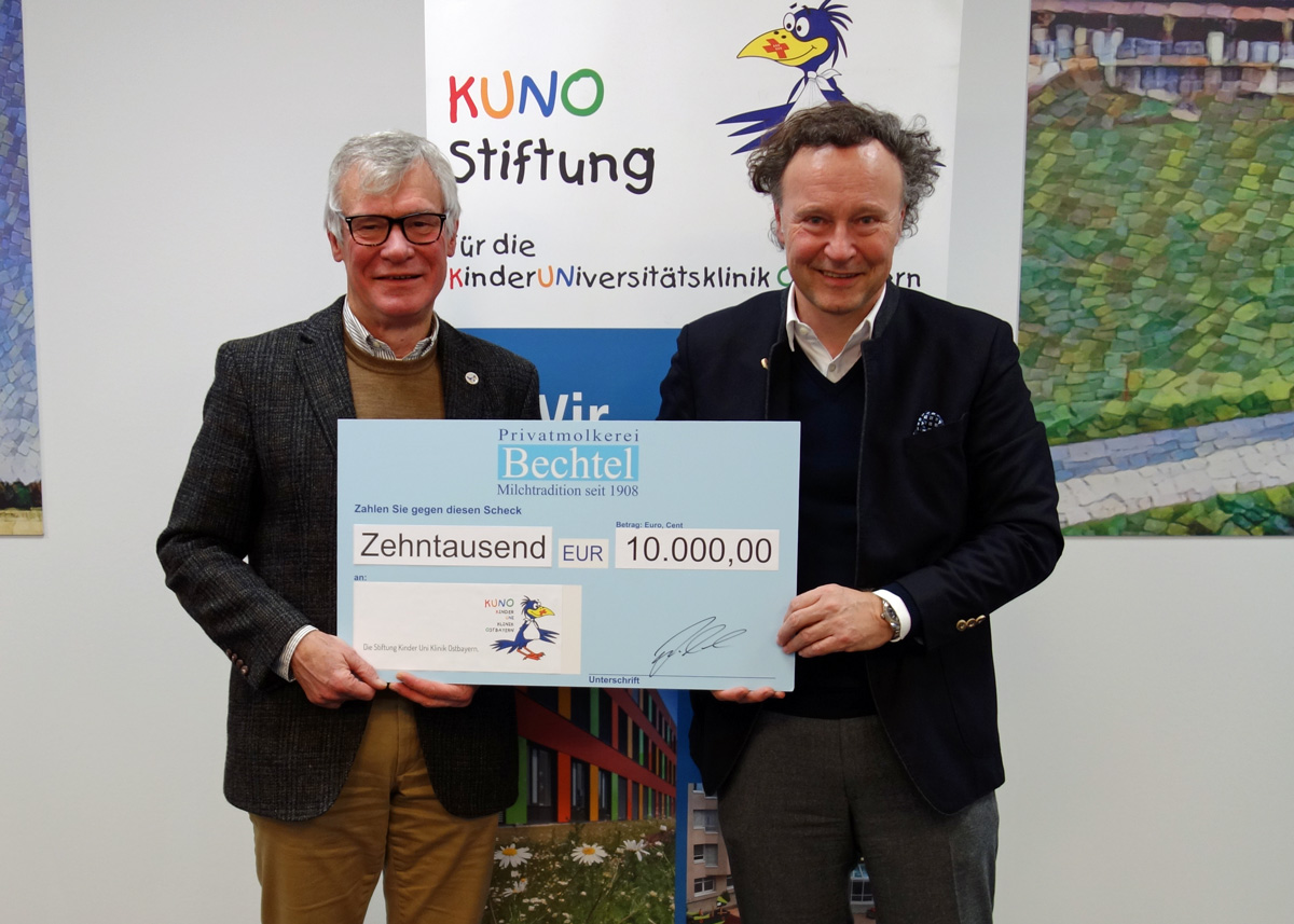 Umso schöner, dass auch ein solcher Betreib nicht nur bereits seit 2021 klimaneutral produziert, sondern sich auch Jahr für Jahr sozial engagiert. In der Adventszeit verteilt die Molkerei jedes Jahr großzügig Spenden an gemeinnützige Organisationen in der Region – und so auch an die KUNO-Stiftung. Herr Geschäftsführer René Guhl ließ es sich nicht nehmen, den Scheck über 10.000 Euro an Stiftungsvorstand Prof. Dr. Hugo Segerer persönlich zu übergeben. Mit einer solchen Summe lässt sich Einiges bewegen – daher ein ganz herzliches Dankeschön von KUNO dafür!