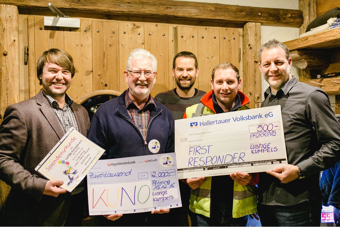Der Verein der Lustigen Kumpels Pförring ist regional und überregional für sein Open Air und weitere Kulturveranstaltungen bekannt. Doch die Lustigen Kumpels verstehen nicht nur etwas vom Feiern, sondern zeichnen sich auch durch ihr großes soziales Engagement aus. Seit der Gründung des Vereins haben die Kumpels bereits knapp 100.000 Euro an die unterschiedlichsten Organisationen gespendet. Die KUNO-Stiftung in Regensburg wird schon seit Jahren immer wieder von den Lustigen Kumpels unterstützt – so auch 2016. Kurz vor Weihnachten machten die geschäftsführenden Vorstände des Vereins, Bernd Gliedl, Markus Pesl und Bernd Wölfl, folgenden Einrichtungen eine große Freude: KUNO in Regensburg mit 2.000 Euro, First Responder Gruppe Pförring mit 500 Euro und Caritas Sozialstation in Kösching mit 500 Euro.