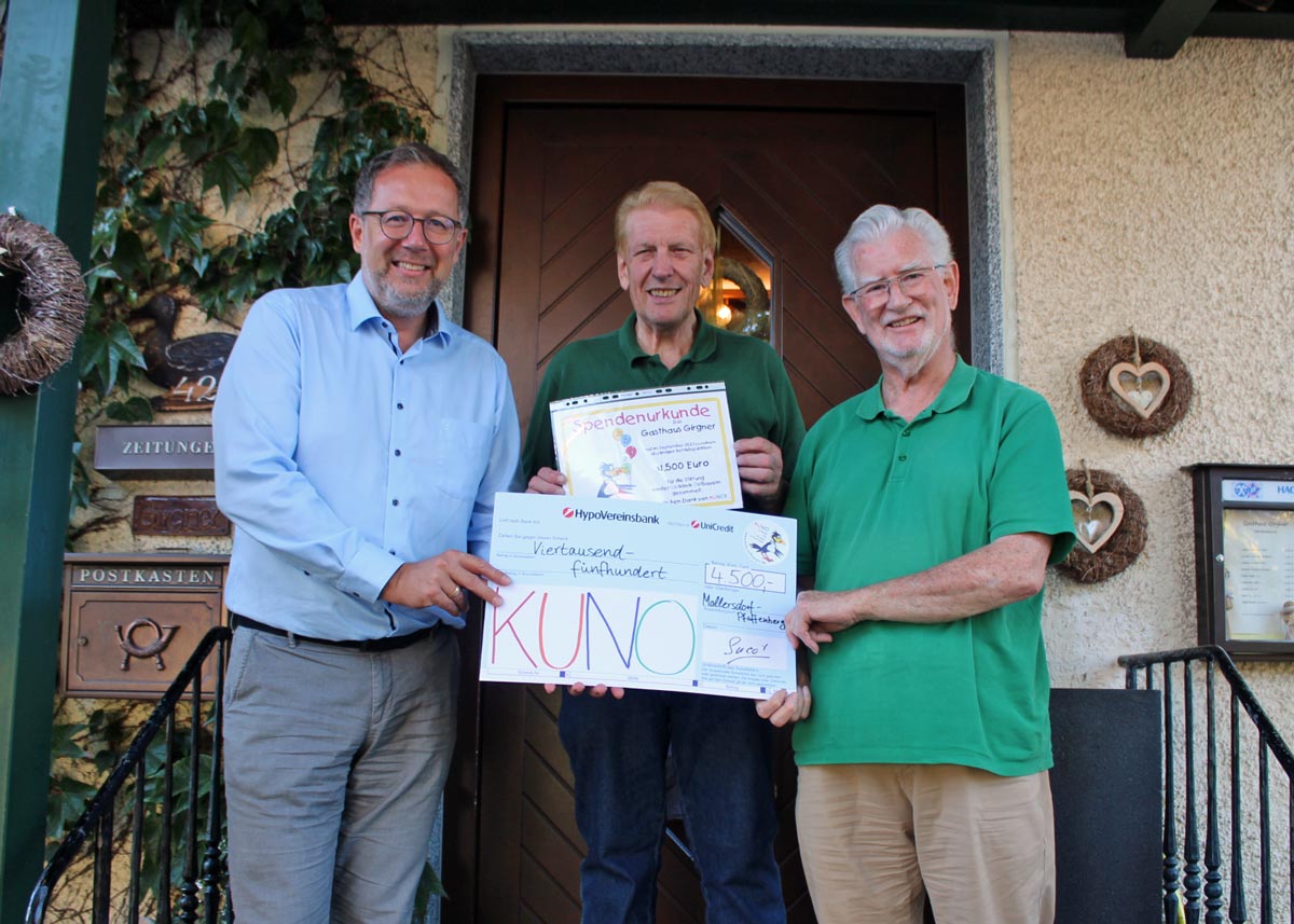 Es zeichnete sich dann schon eine größere Summe ab, die noch aufgestockt wurde von mehreren Stammgästen, bis dann die 4500 Euro beisammen waren. Dr. Hans Brockard, Vorstandsmitglied der KUNO-Stiftung, war sehr beeindruckt, als er vom Zustandekommen dieser beachtlichen Summe erfuhr. Nicht nur er, sondern auch Bürgermeister Christian Dobmeier, der als Schirmherr des Oktoberfestes fungierte, würdigten den Einsatz der Wirtsleute Leni und Suco, die mit ihrem Engagement einen wertvollen Beitrag leisten konnten für kranke Kinder. (Text/Foto: Annemarie Kammermaier)