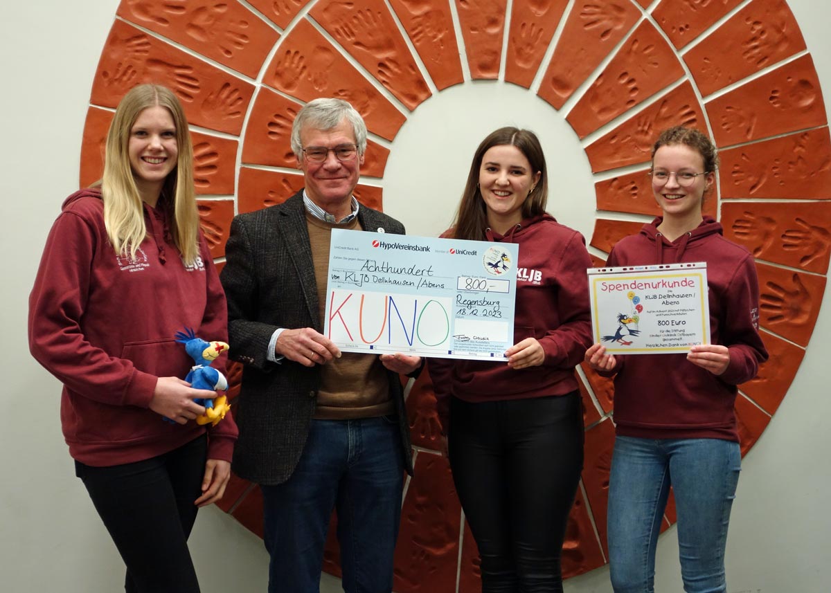 Eine eindeutige Versorgungslücke für die Jugend zwischen Wolnzach und Freising hat der KLJB Dellnhausen / Abens mit seiner Wiedergründung vor gerade einmal zwei Jahren geschlossen. Selbst wenn die Ortschaft nur ca. 100 Einwohner zählt, hat die KLJB-Gruppe bereits jetzt über 200 Mitglieder, die sich auch in der Vorweihnachtszeit sozial engagieren. Allein durch den Verkauf von Punsch und Plätzchen im Advent konnten die Jugendlichen dieses Jahr stolze 800 Euro erwirtschaften. Die KUNO-Stiftung durfte sich freuen, vom KLJB Dellnhausen / Abens als Spendenempfänger ausgewählt worden zu sein und so nahm KUNO-Vorstand Prof. Dr. Hugo Segerer den Scheck von der KLJB-Vorstandschaft, bestehend aus Franziska Kraft, Claudia Fuchs und Johanna Eberwein, sehr gerne entgegen. Vielen Dank an alle Mitglieder für diese Unterstützung!