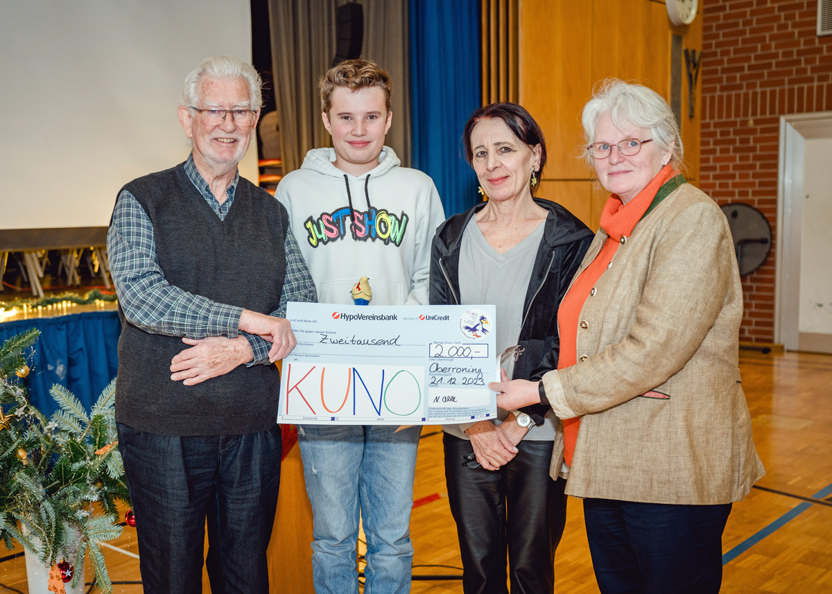Die zur Schulstiftung der Diözese Regensburg gehörende Realschule Oberroning begeht traditionell am vorletzten Schultag vor Weihnachten ihre Weihnachtsfeier. Gast war in diesem Jahr KUNO – denn bei der Weihnachtsfeier wird der Erlös aus dem Spendenlauf im Sommer für einen guten Zweck gespendet. Die ganze Schulgemeinde hatte sich in der geschmückten Turnhalle versammelt und die Schüler und Schülerinnen lauschten nicht nur dem Bläserensemble und dem Chor der Schule, sondern hatten auch eigene Weihnachtswünsche formuliert und trugen diese vor.
