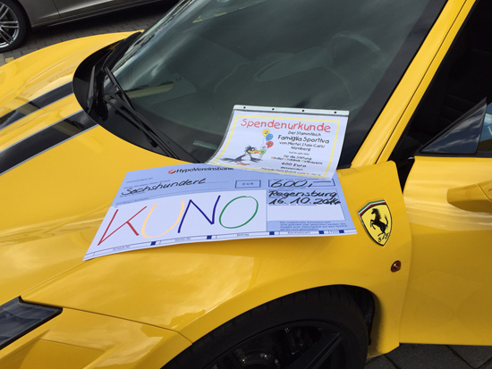 Mario Grummt (l.) kam extra aus Nürnberg mit einem Ferrari Sondermodell, dem Ferrari 458 Speciale in Gaillo Modena Gelb und überreichte stellvertretend für MERTEL Italo Cars Nürnberg und den Stammtisch FAMIGLIA SPORTIVA den Scheck an KUNO.