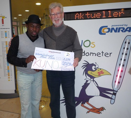 Mano Ezoh, Gospelsänger und Chorleiter aus Deggendorf überreichte 3.500 Euro an Dr. Hans Brockard für KUNO. Am 21.11.08 hatte das große Gospelkonzert „Total Praise“ im ausverkauften Audimax der Regensburger Universität zugunsten von KUNO stattgefunden.