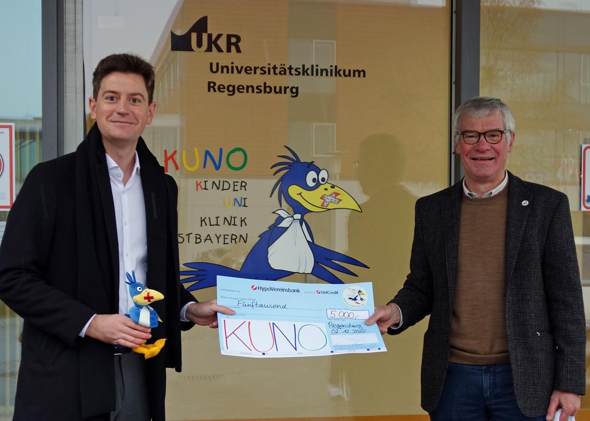 Herr Christian Edenharder, Kaufmännischer Leiter der EvivaMed Handelsgesellschaft mbH, überreichte stellvertretend für das gesamte Team der Firma einen Spendenscheck in Höhe von 5.000 Euro an Herrn Prof. Dr. Hugo Segerer, dem Stiftungsvorstand der KUNO-Stiftung, am Uniklinikum Regensburg. Vielen Dank dafür von KUNO!