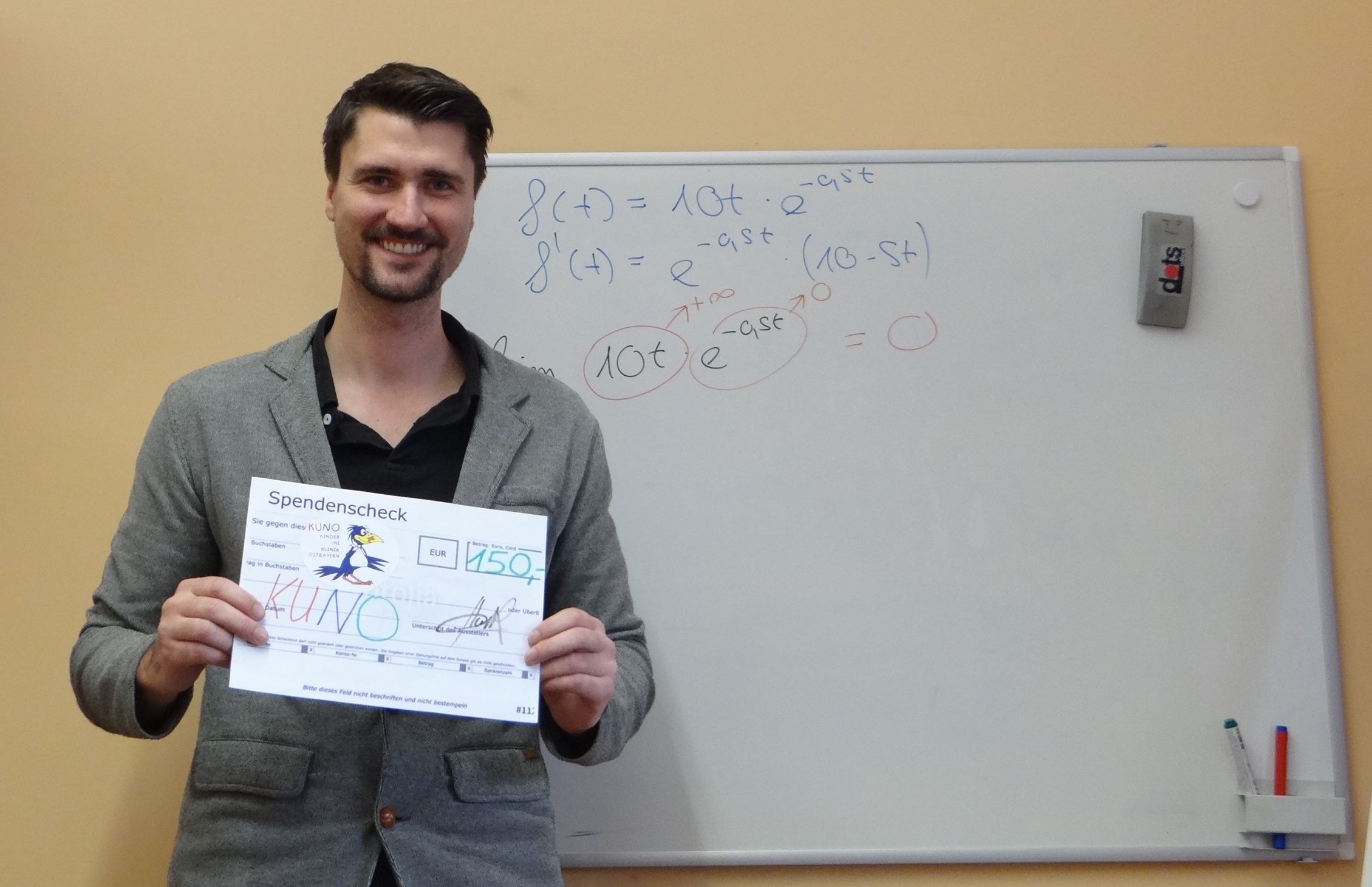 Beim Mathe-Powertag hat die angehenden Abiturienten die Möglichkeit, sich auf die bevorstehenden Abiturprüfungen in Mathe vorzubereiten. Den Erlös aus der Veranstaltung in Höhe von 150 Euro spendete der Organisator Herr Klupak an KUNO.