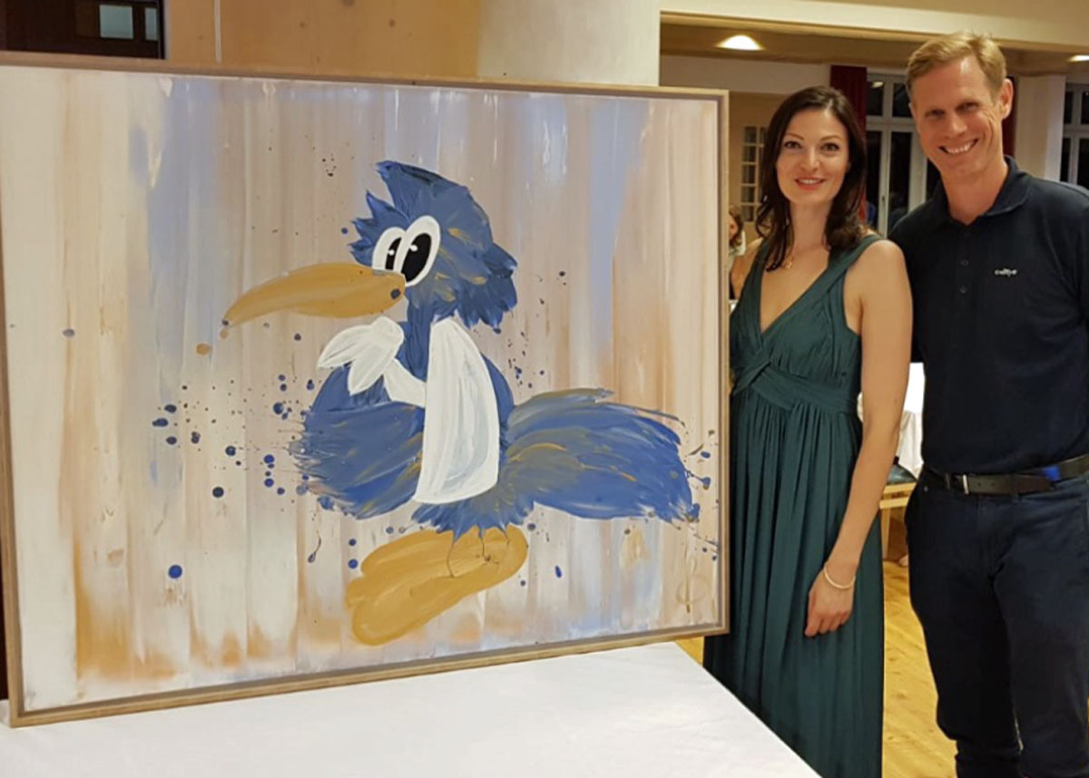 Das Engagement für KUNO von Frau Bettina Reichl ist seit ihrer ersten „Federleicht“-Ausstellung von Hühner-Bildern im Jahr 2016 bemerkenswert. Sie hat über die Jahre einen nicht unwesentlichen Teil des Erlöses aus ihren Ausstellungen an KUNO gespendet und den blauen Vogel sogar portraitiert. Dieses Potrait wurde nun erfolgreich für die Stiftung versteigert.