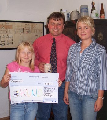 Kindergarten St. Anna spendet für KUNO 27.08.2006 Durch Aktionen und Feste unterstützt der Kindergarten St. Anna in Winzer regelmäßig gemeinnützige und soziale Projekte. Auch KUNO darf sich über eine großzügige