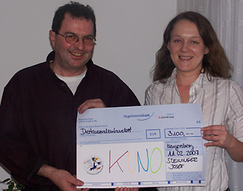 3.100 Euro als Vermächtnis für KUNO 11.02.2007 Hengersberg – Einen Spendenscheck in beachtlicher Höhe hat KUNO-Vertreterin Katharina Weinberger in Hengersberg entgegengenommen. Dies war der Wunsch von Irene Steininger, die am