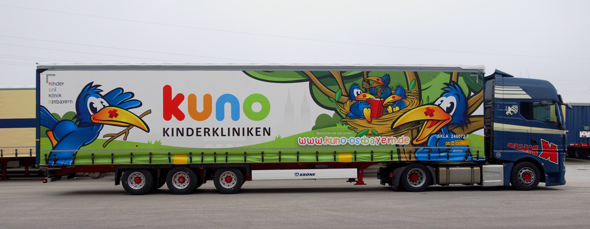 Also beschloss die Familie Krieger kurzerhand, einen neuen Auflieger in eine große, rollende Werbefläche für KUNO zu verwandeln. In Zusammenarbeit mit dem Auflieger-Hersteller Krone und Mediengestalter Marco Süßmilch kam dabei ein echtes Schmuckstück heraus, das in Kürze in ganz Deutschland, Österreich, Ungarn und Italien unterwegs sein wird, um die Dinge des täglichen Lebens zu transportieren. KUNO-Vorstand Hugo Segerer durfte aber schon vorab einen kurzen Blick auf das fantastische Ergebnis werfen. Fazit? „Es gibt wohl kaum einen schöneren LKW auf den Straßen. Möge er lange und vor allem unfallfrei unterwegs sein!“ Ein herzliches Dankeschön an Alle, die das möglich gemacht haben!