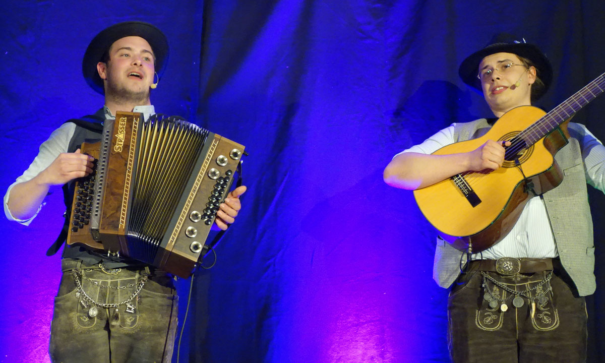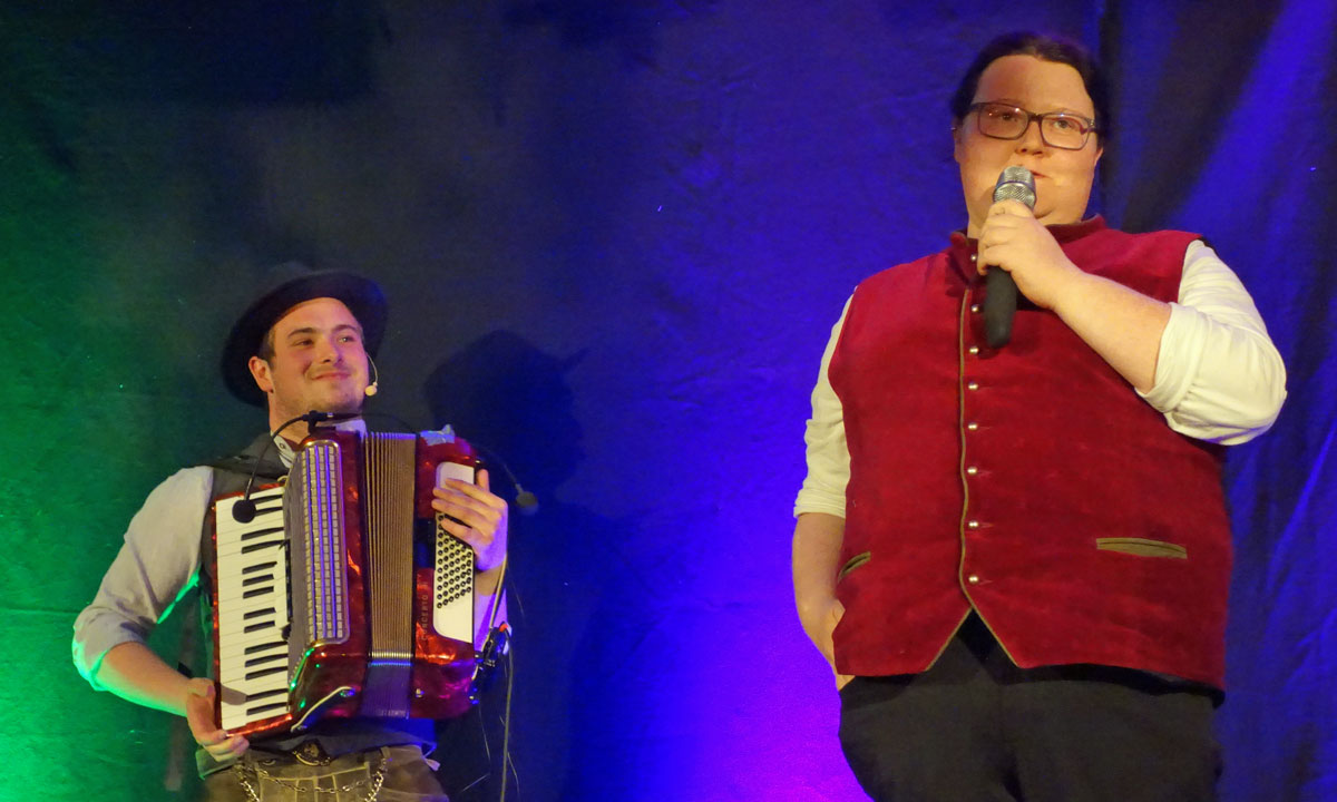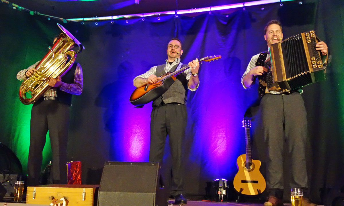 Barbara Preis wagte sich mitten ins Publikum und nahm wie auch die beiden Bands liebevoll die alltäglichen zwischenmenschlichen und zwischengeschlechtlichen Probleme aufs Korn. Im Mittelpunkt stand allerdings die Musik in der klassischen Wirtshausbesetzung mit Gitarre und Steirischer, beim Trio Schleudergang ergänzt durch die Tuba, bei der die Töne bekanntlich garantiert mit dem Mund gemacht werden …