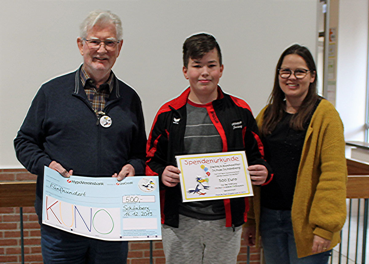 Die Aktion „Kinder laufen für Kinder“ an der Dietrich-Bonhoeffer-Schule in Schönberg war am Ende des Schuljahres 2018/19 nicht nur eine willkommene Abwechslung zum Schulalltag, sondern hilft auch den kleinen Patienten der KUNO-Kliniken. Schüler und Kollegium waren an Sponsoren herangetreten, die die für die gelaufenen Strecken einen bestimmten Betrag auslobten. So kam ein hübsches Sümmchen zusammen, von dem 500 Euro an KUNO gespendet wurden. Die Einladung der Schulleitung, die sportlich engagierten Kinder der Dietrich-Bonhoeffer-Schule persönlich kennenzulernen, nahm Stiftungsvorstand Dr. Hans Brockard gerne an und erzählte auch gleich, wofür das erlaufenen Geld jetzt verwendet wird und warum die Spendengelder für die Kinder in den KUNO-Kliniken so wichtig sind.