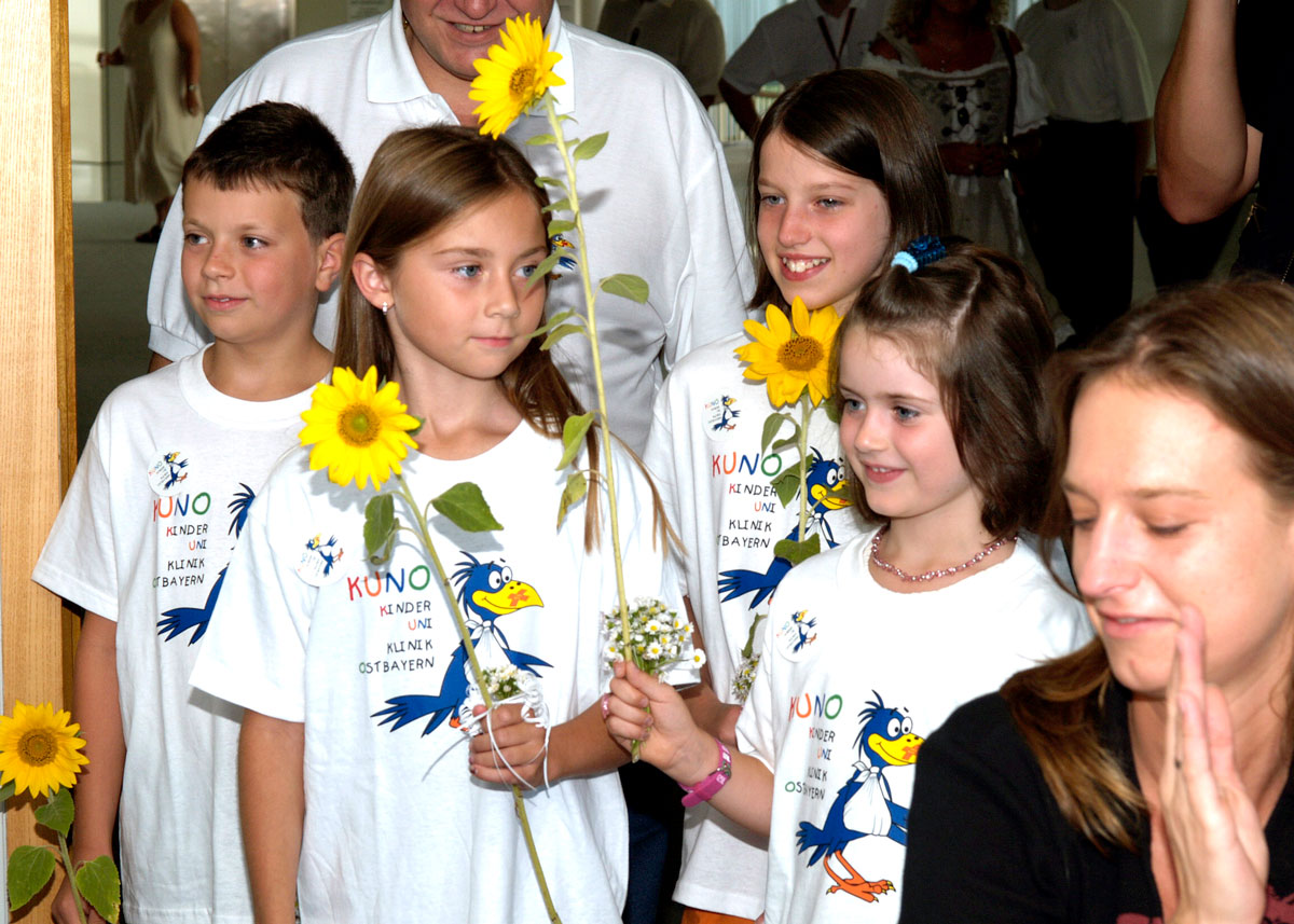 Zur feierlichen Übergabe der Spende im großen Sitzungssaal des Uniklinikums Regensburg kamen dann auch die Blumenkinder aus Piesenkofen mit ihren Eltern und überreichten ein Sträußchen selbstgepflückter frischer Gänseblumen, sehr zur Freude der Familie Conrad.